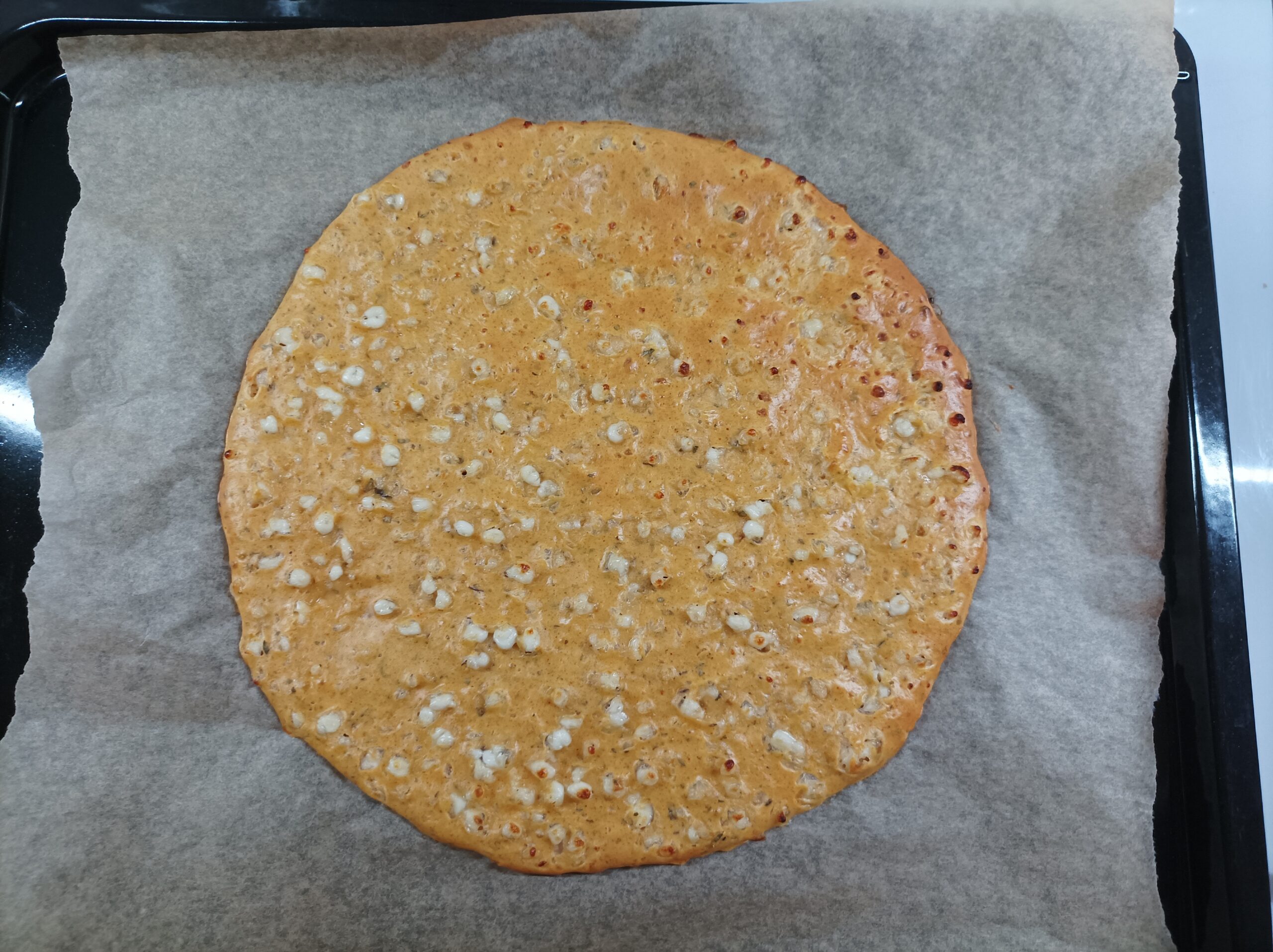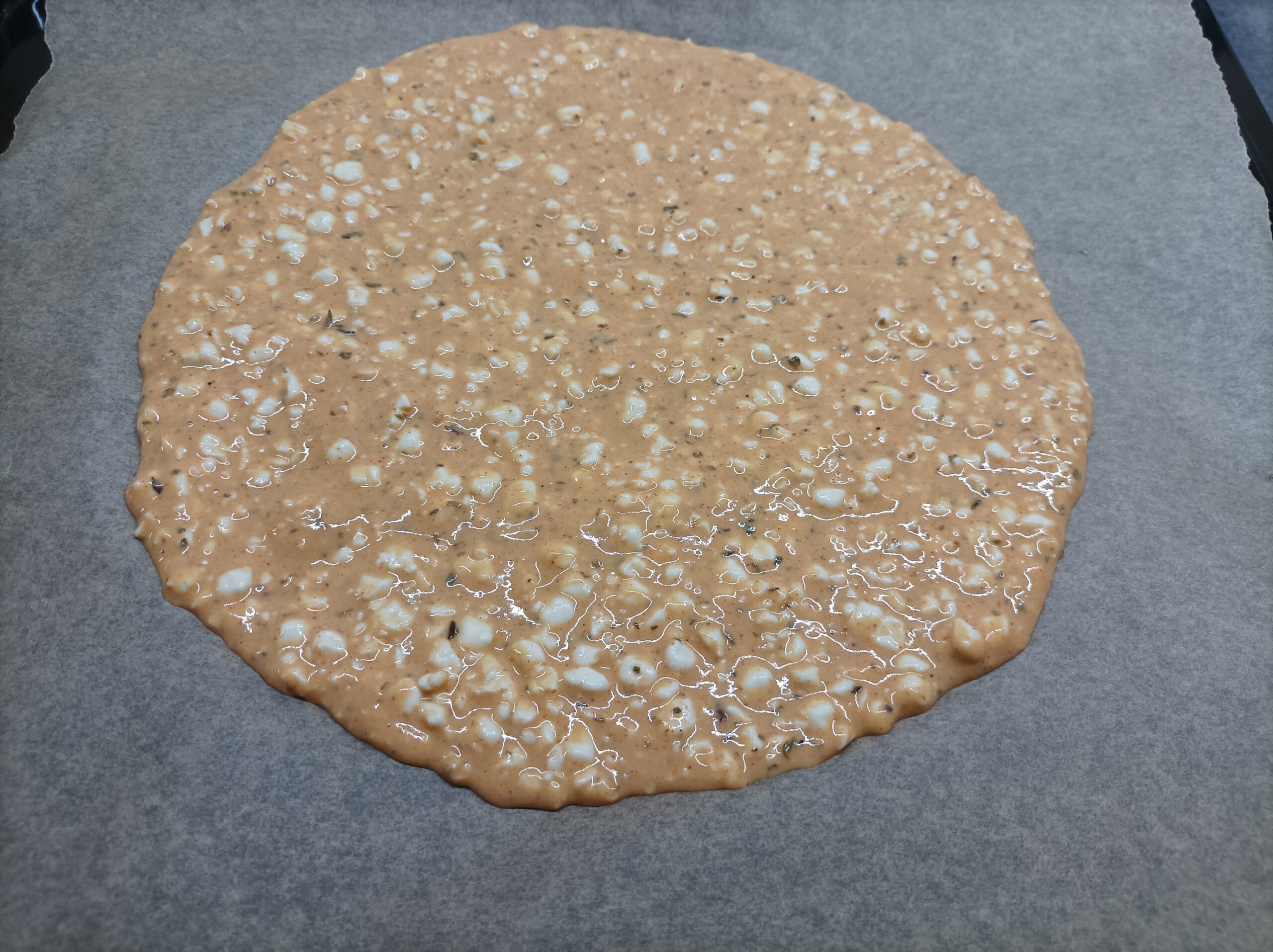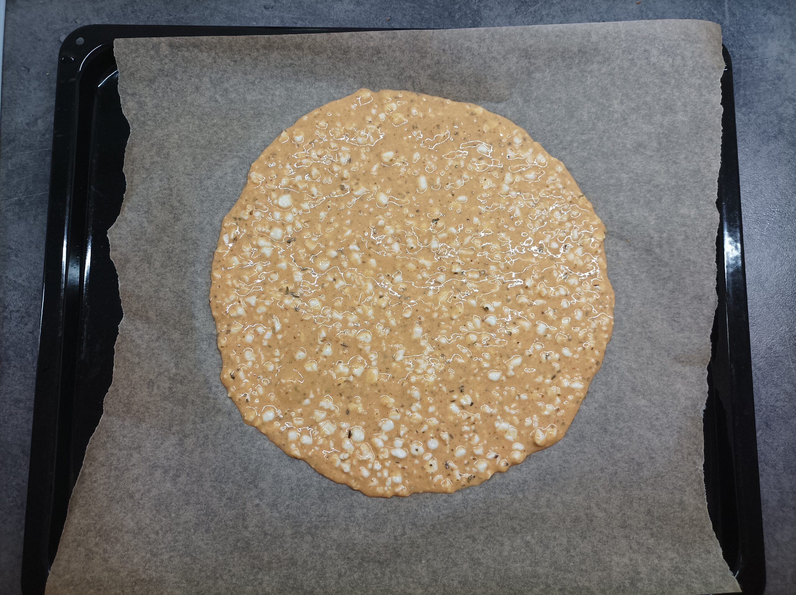 - Blachę piekarnikową wyłożyć papierem do pieczenia, wylać ciasto na blachę i rozprowadzić na okrąg. U mnie wychodzi średnica ok. 40cm.