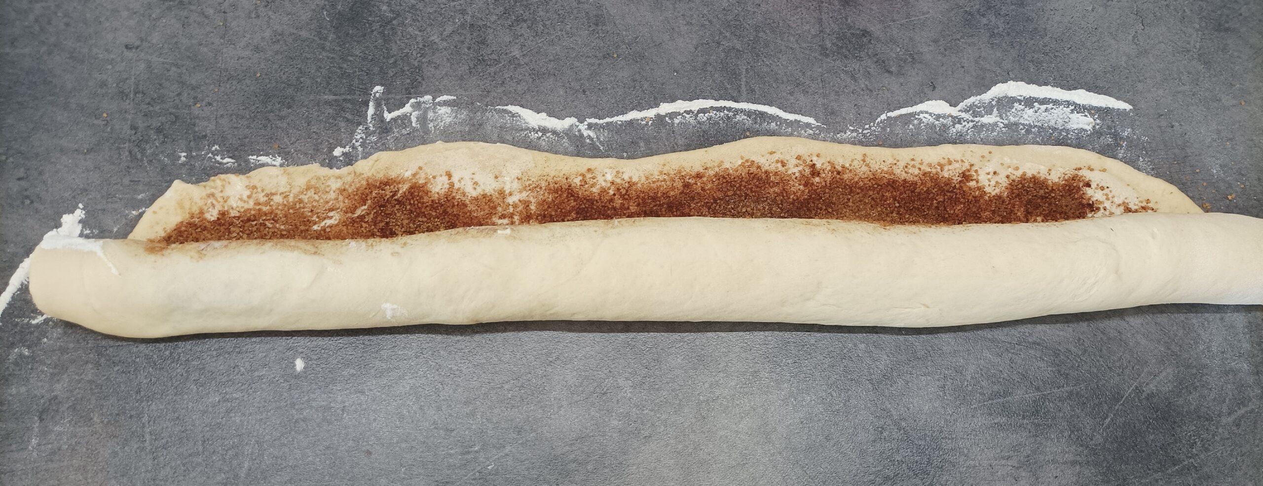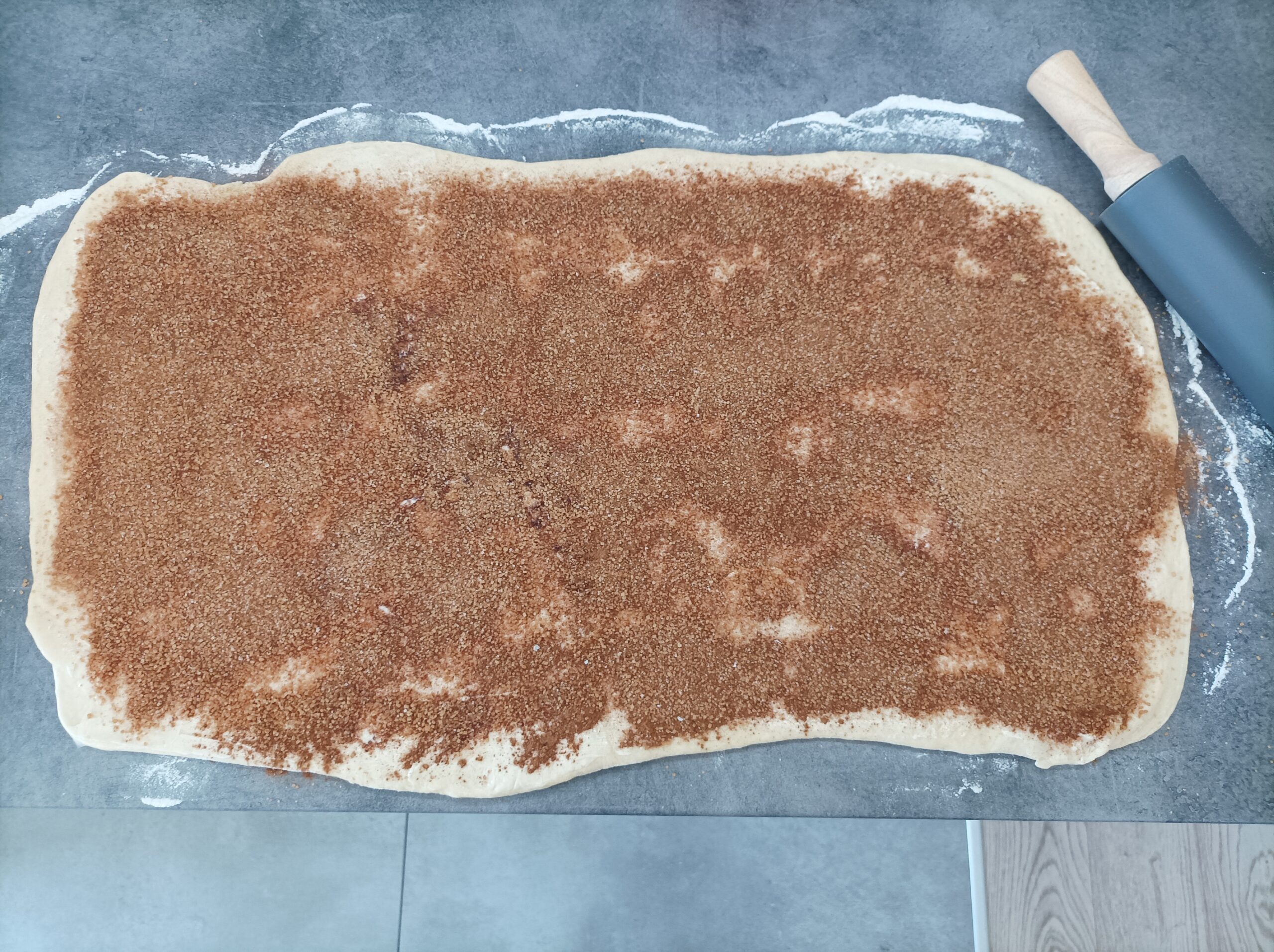 - Wyrośnięte ciasto rozwałkować na prostokąt, posmarować masłem po całości i posypać cukrem z cynamonem.