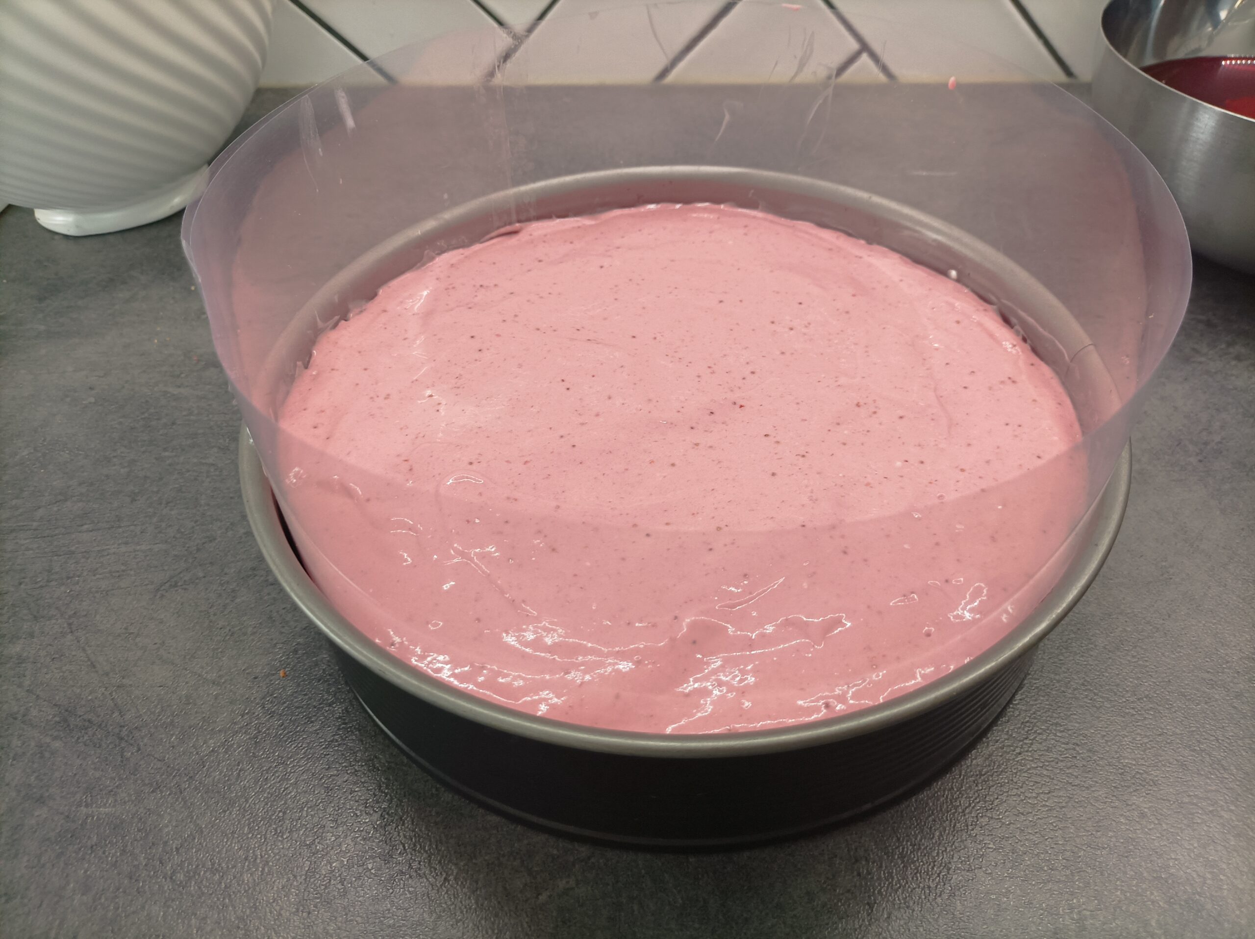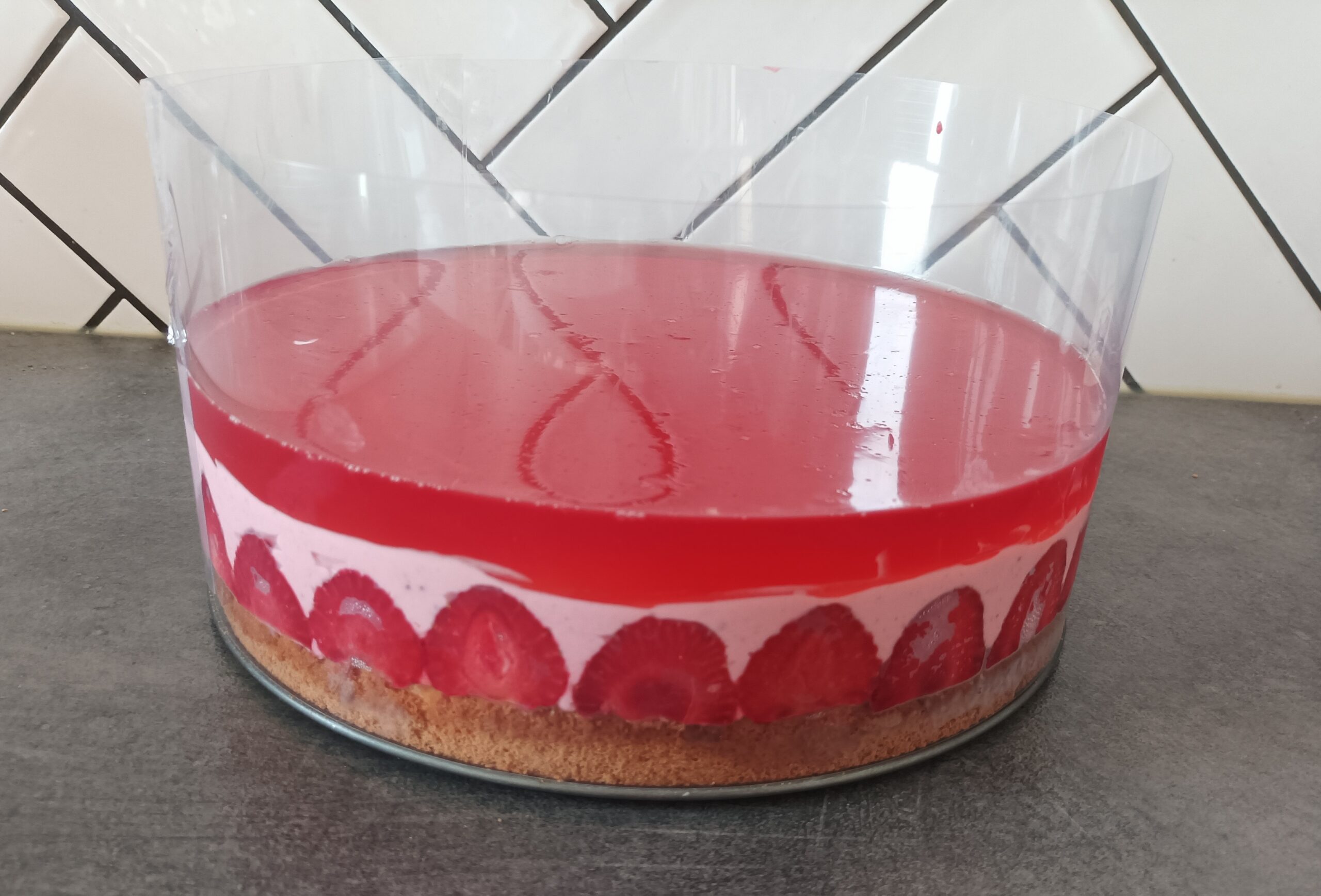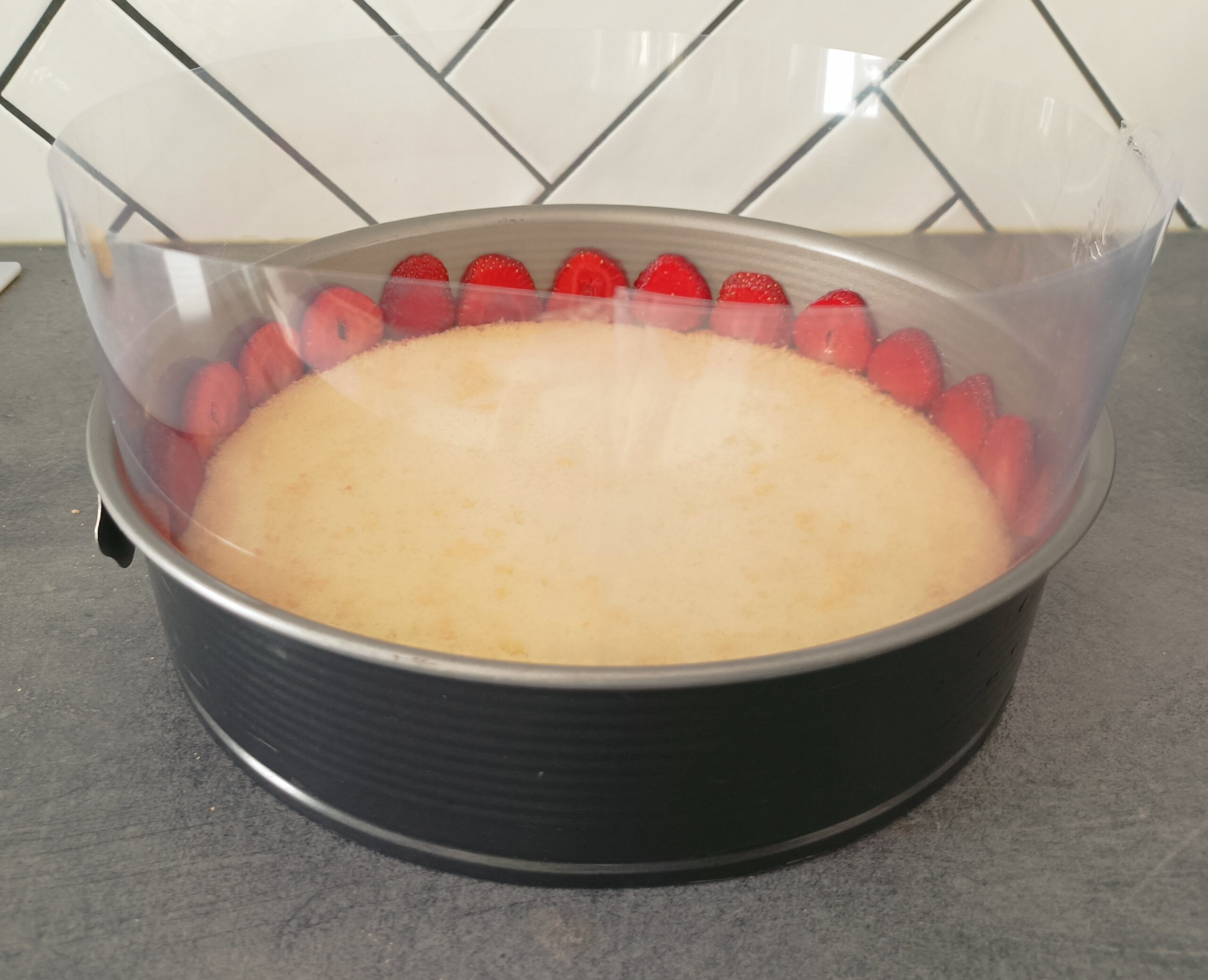 • między boki tortownicy a biszkopt włożyć folię rantową – zabezpieczy ona truskawki, mus i galaretkę przed wylaniem. W razie braku folii rentowej można ewentualnie użyć papieru do pieczenia gdy foremka jest wyższa