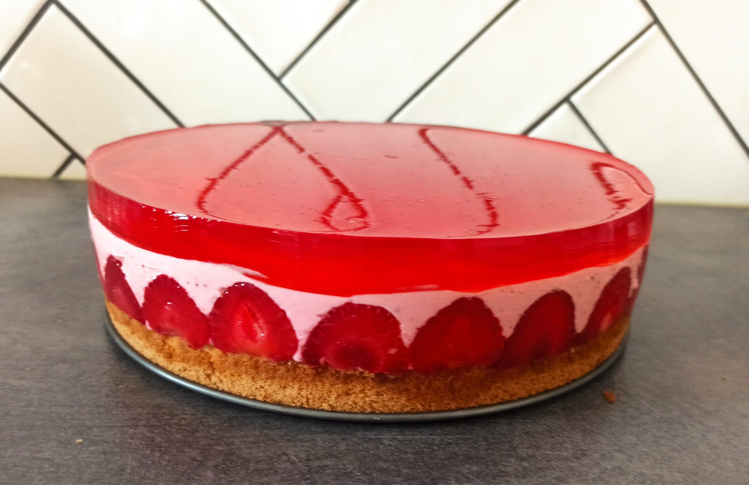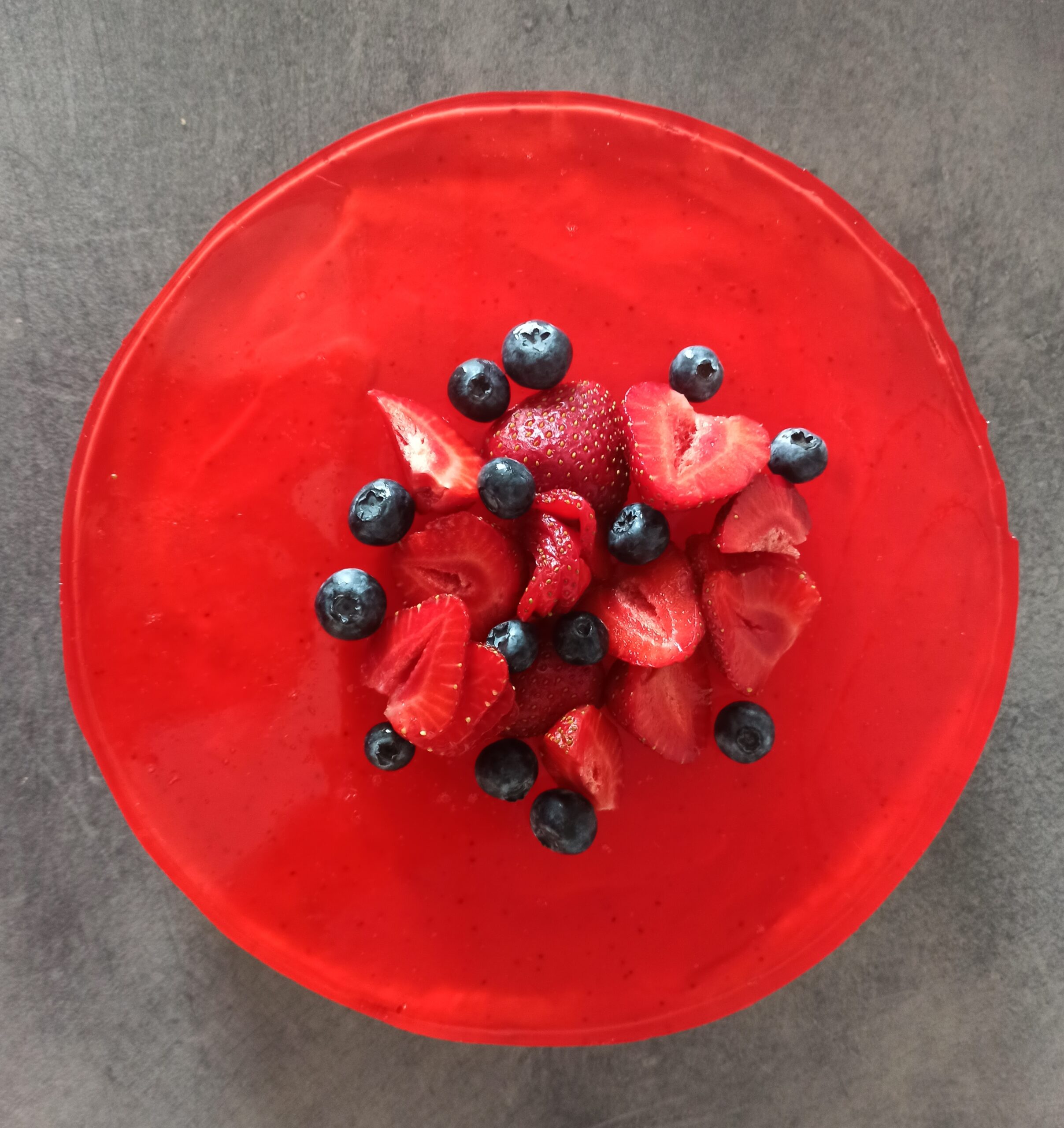3. Galaretkę wylać delikatnie i ostrożnie na mus truskawkowy. Delikatnie i ostrożnie żeby nie zrobiły się “dziury” w musie od strugi galaretki.