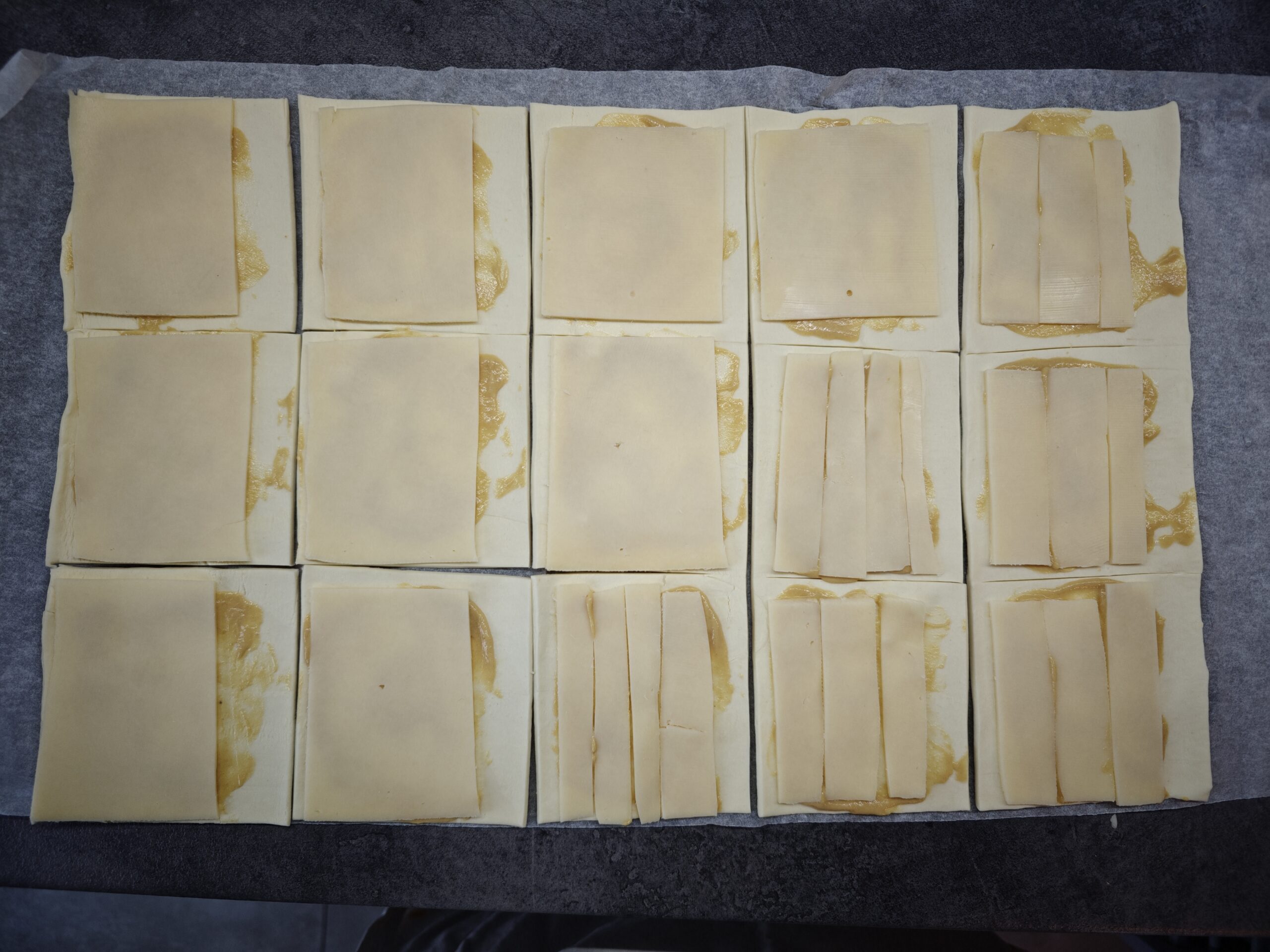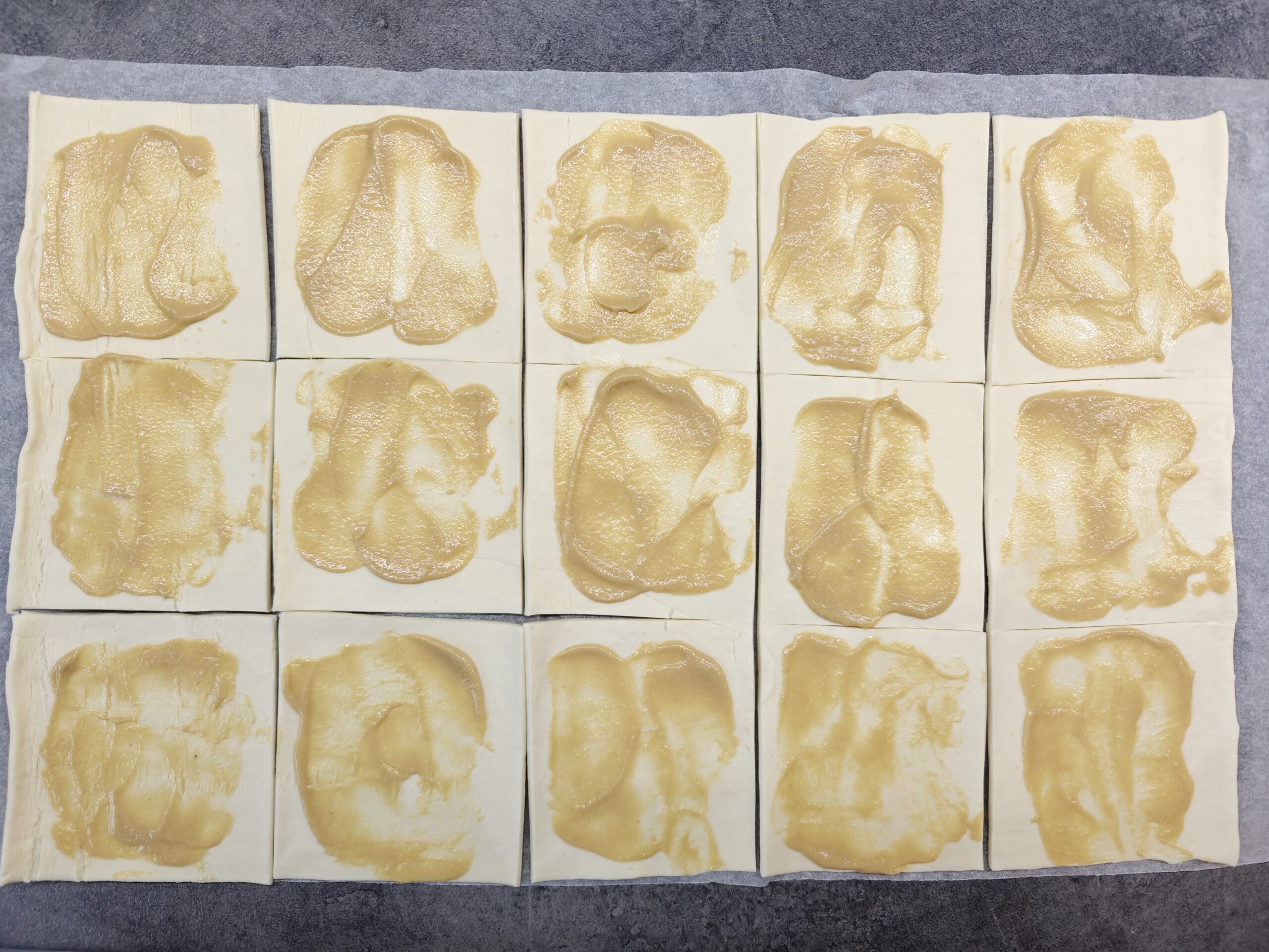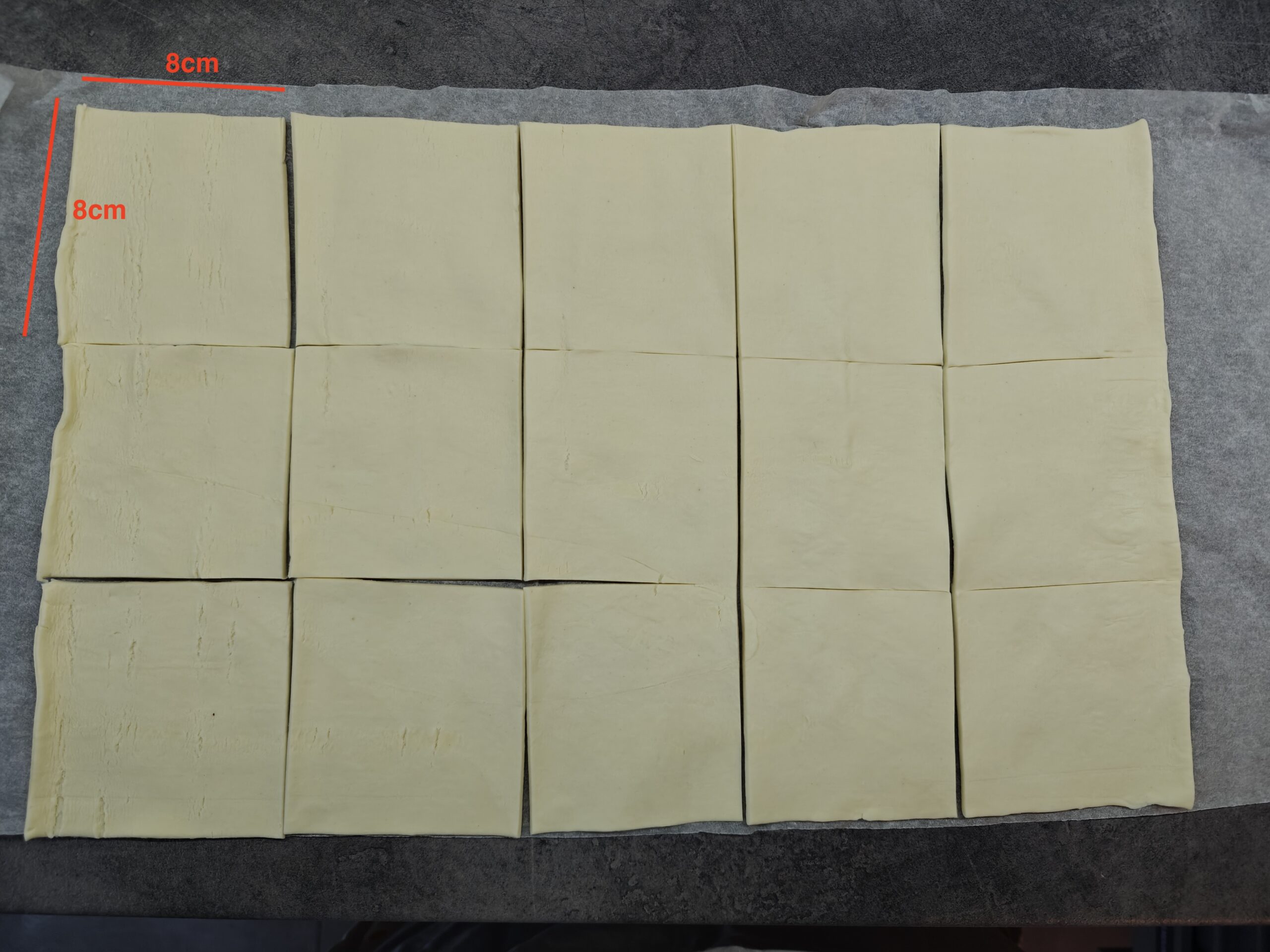 - Ciasto francuskie wyjąć z opakowania, rozwinąć, pokroić na kwadraty 8×8 cm.