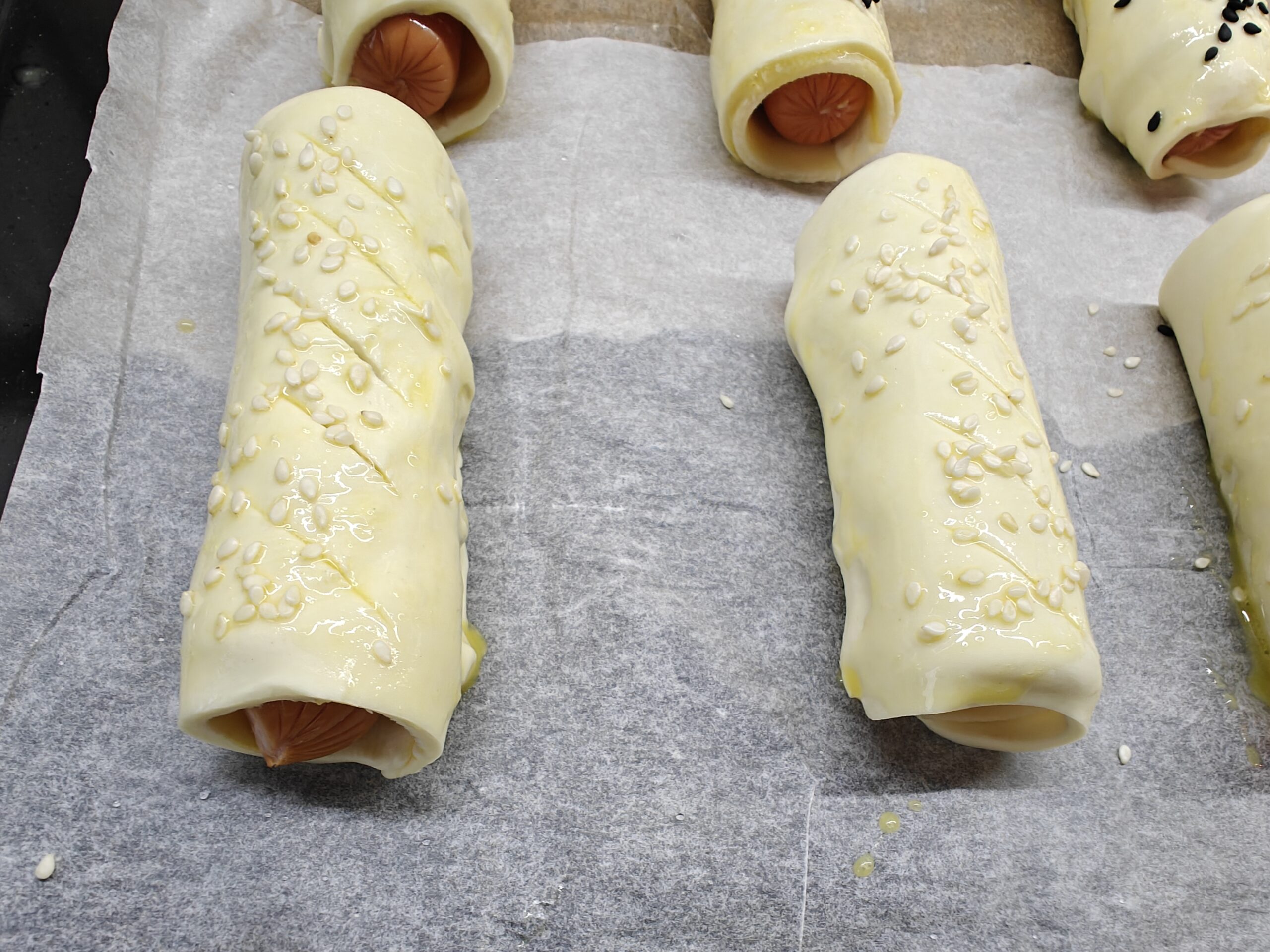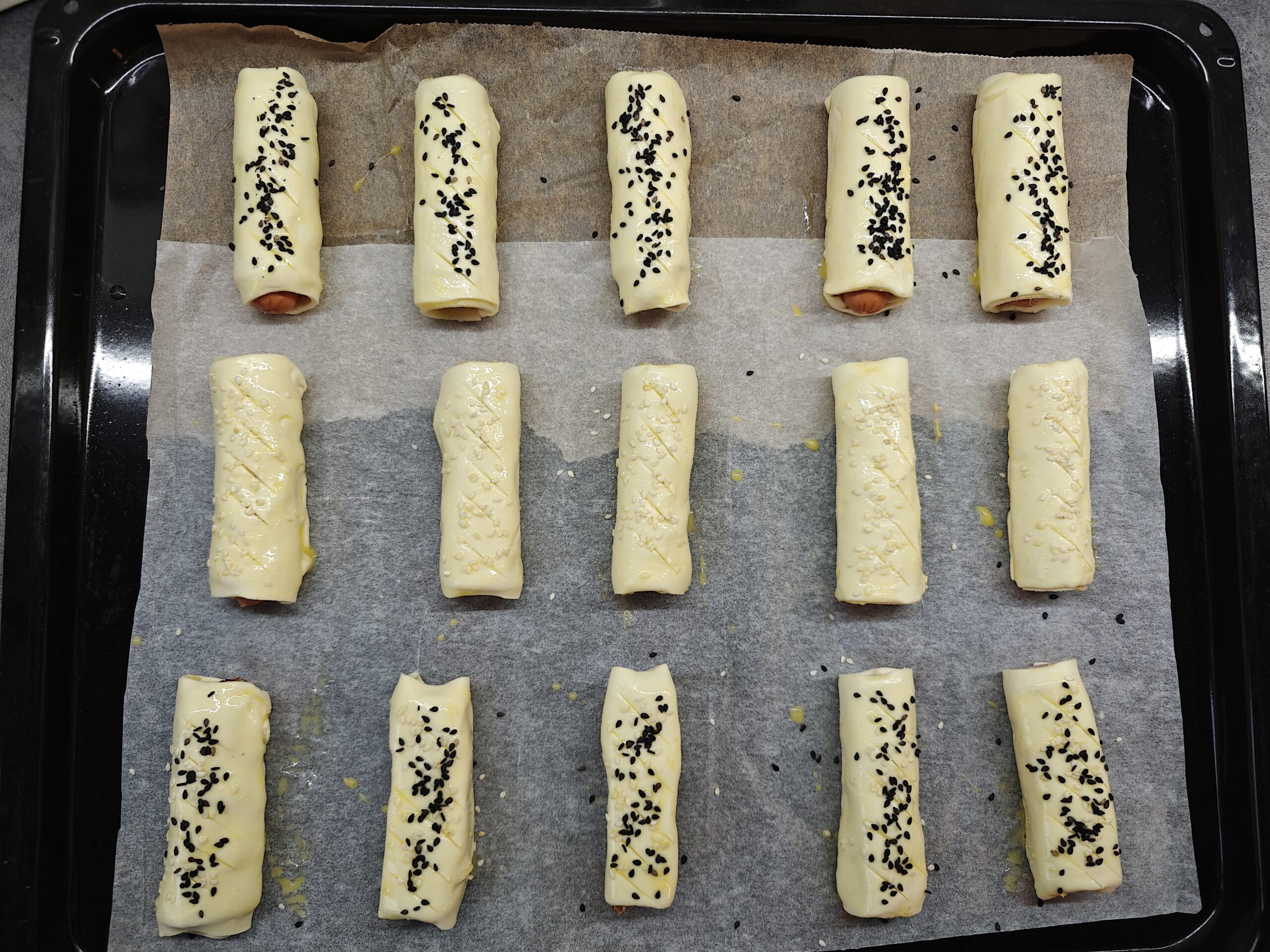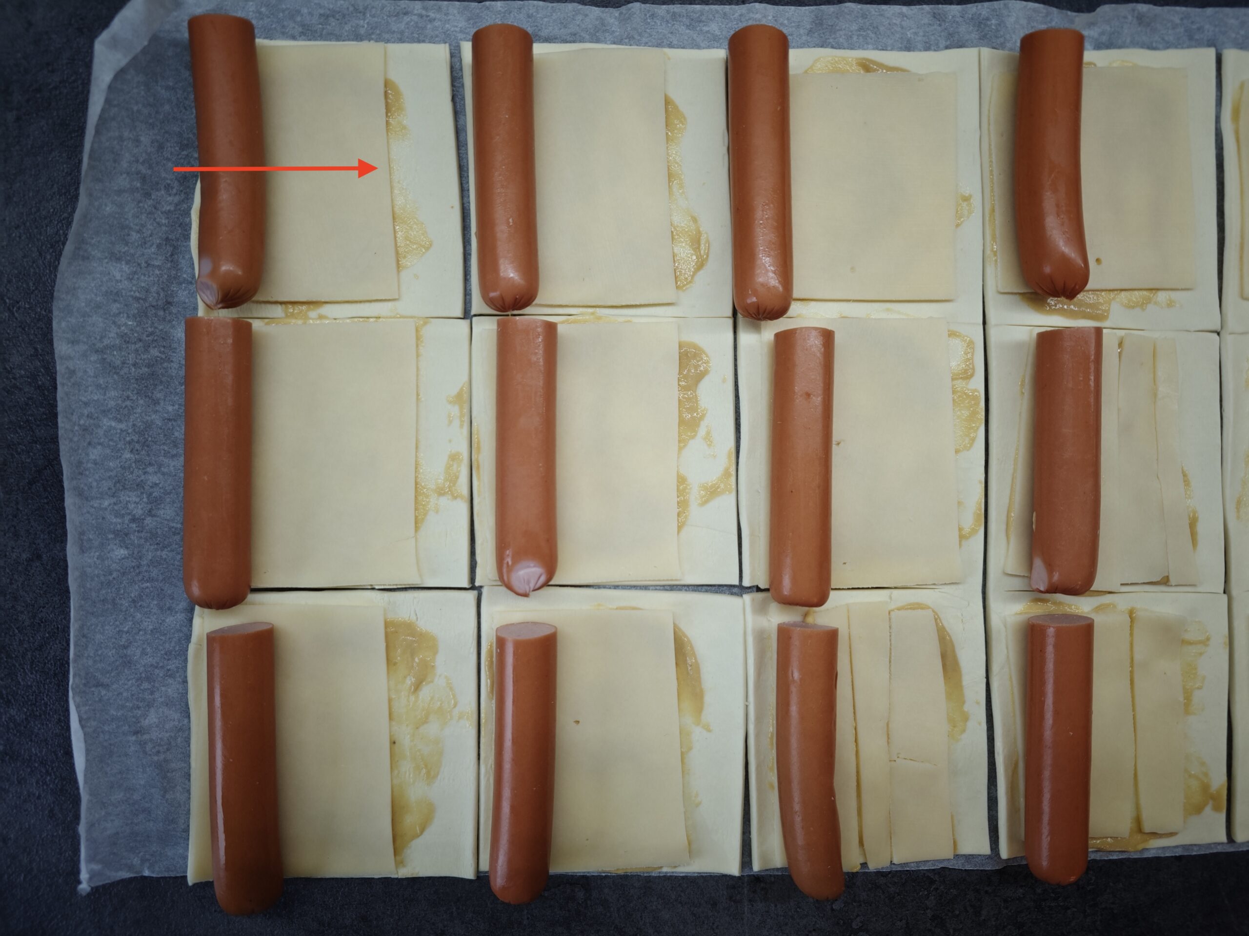 - Zwijać od lewej do prawej, trzymając składniki ciasno. Na końcu zlepić ciasto. Gotowy zwinięty hot-dog odłożyć na blachę do pieczenia wyłożoną papierem do pieczenia, szwem/zlepionym ciastem do spodu.