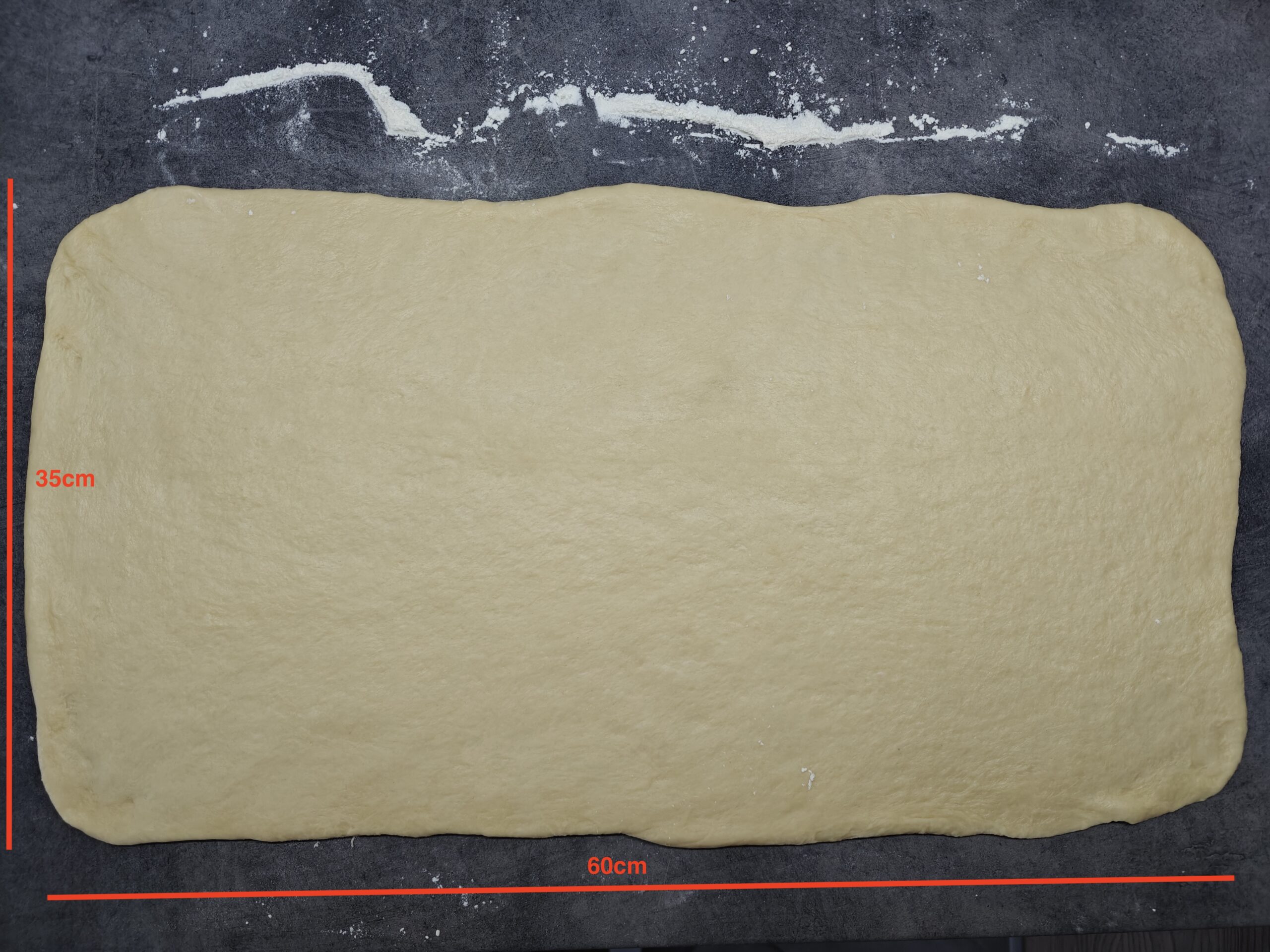 - Wyrośnięte ciasto wyłożyć na blat podsypany mąką, rozwałkować na prostokąt ok. 60×35 cm.