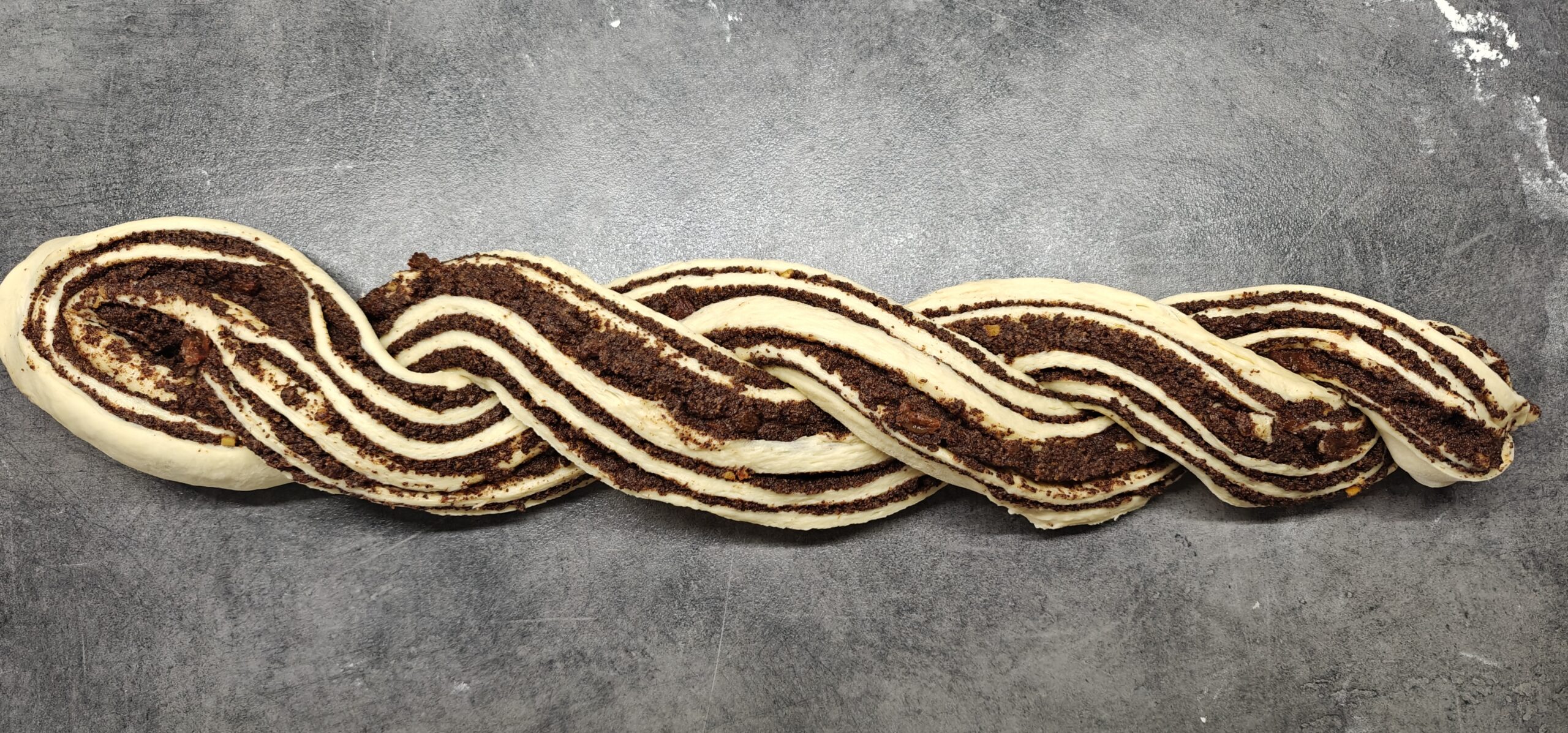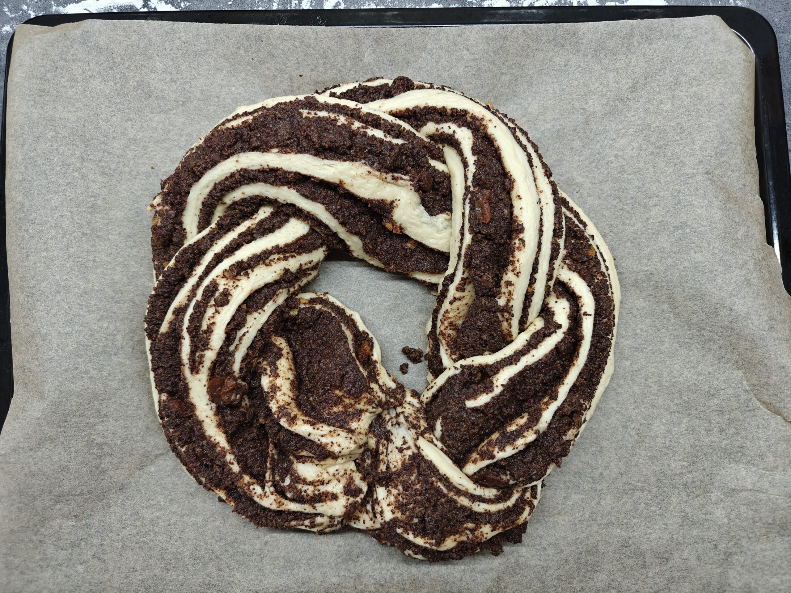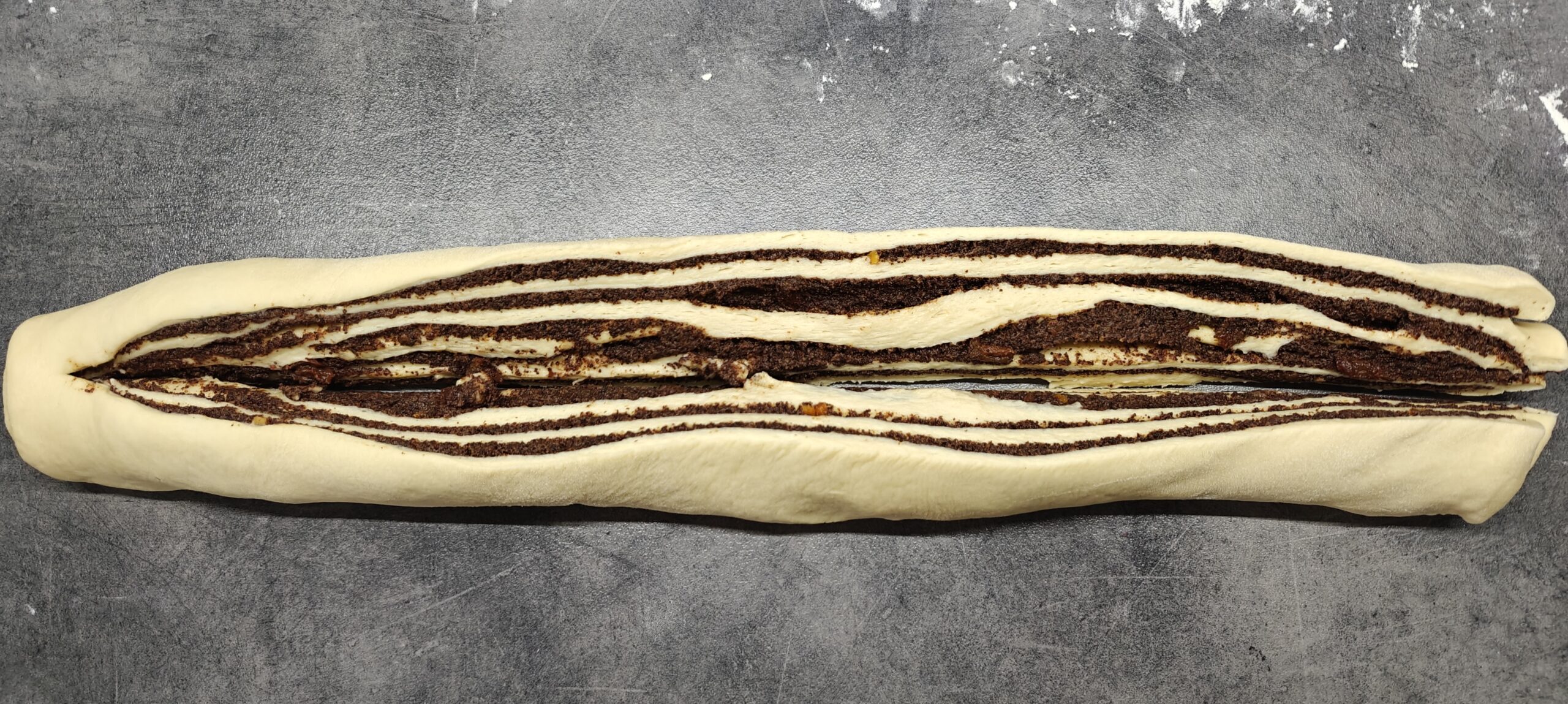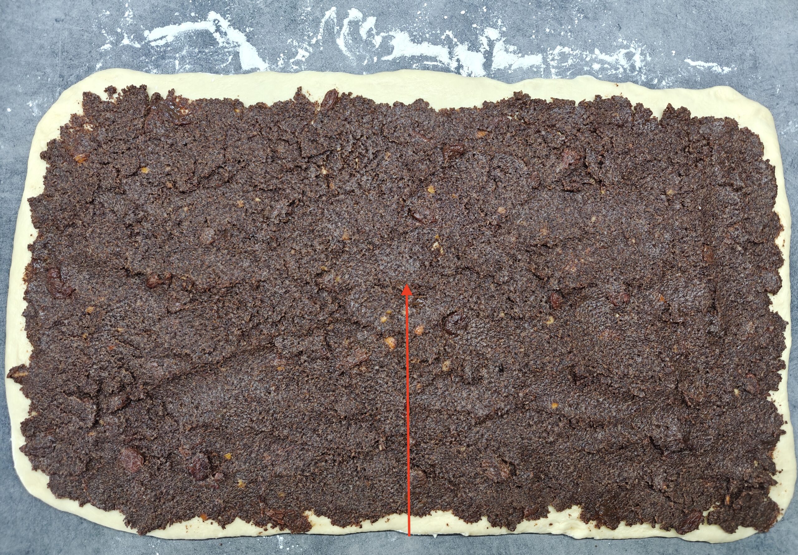 - Ciasto zwinąć wzdłuż krótszego brzegu, zlepić na końcu, ustawić szwem do dołu.