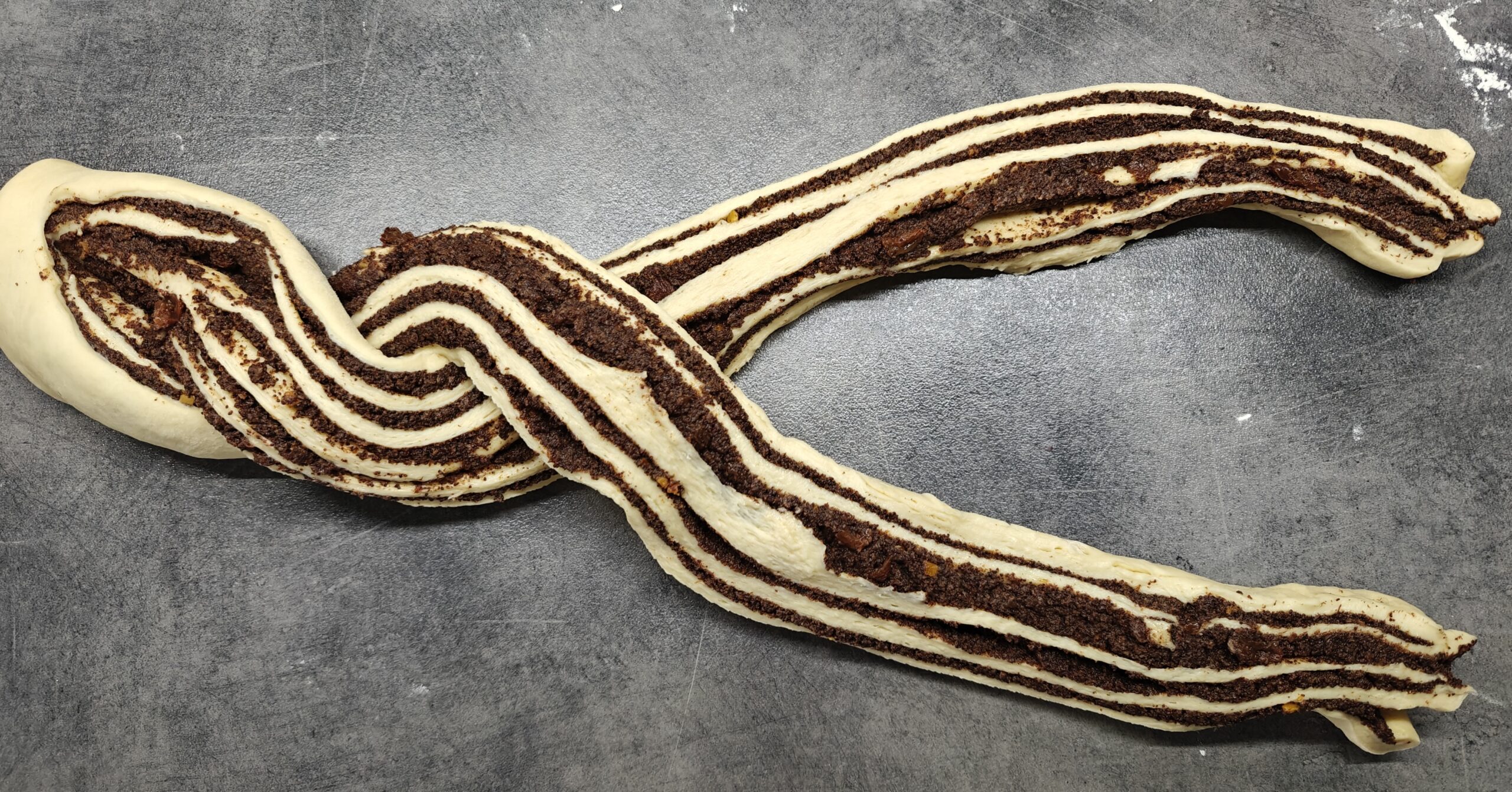 - Rulon z ciasta przeciąć w środku wzdłuż, zostawiając nierozcięty 1 koniec.